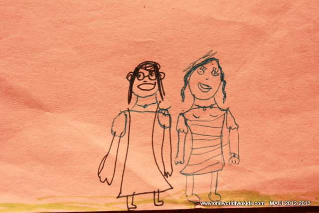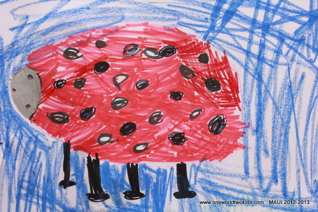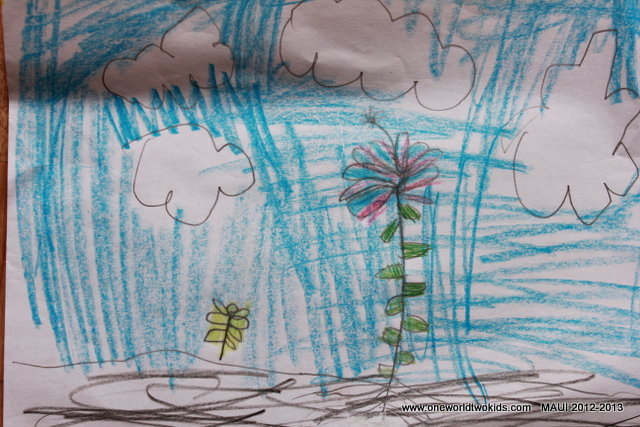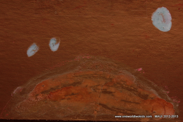A travel van trip to Honolua Bay and the beach below the Ritz Carlton. A very manicured lawn. The clouds and rain kept us from staying too long. We saw two pigs behind a fence, Koco and Moco. Ezra and Viena are doing a dance fashion show with sleeping bags, mermaids, spirulina mustaches, blue humpback baby whale, a green water frog. Dwana has a headache. Sunny where we are. Found a centipede in the pool the flowers are so fragrant. Made lots of cookies.