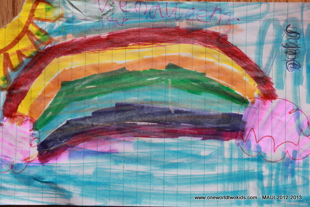 As sure as wind blows. I saw a rainbow. Today the winds blew again. I saw the famous wind surfing beach. I see how things are. I see the island fever. I see the small towns surrounded by Island. The drive to Makawao. The winding roads on the side of a volcano heading down narrow winding roads painting the huge volcano as they reach down to the sea. Jumped in the pool with Ezra and Viena.