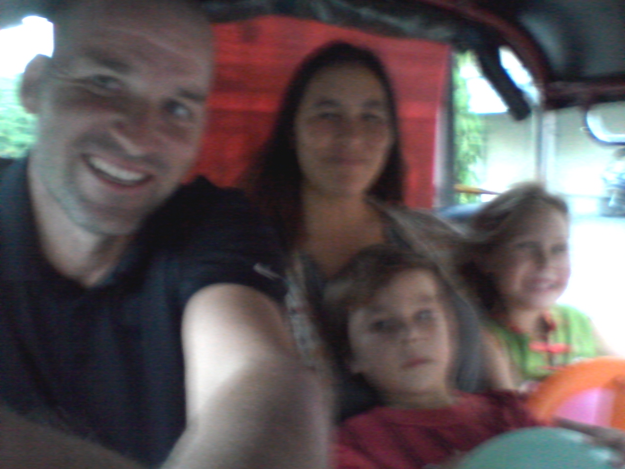 The longest day of the year. Summer solstice. Winter solstice. The shortest day of the year. Jerry’s birthday. Dwana and Foley’s anniversary. I made sure I used every part of this day. While Dwana was meditating, Viena, Ezra and I loaded up some water, cashews, and doggie treats and headed up to the Yoga Sala and grabbed Dwana before Yoga to go on a walk to feed the wild dogs of the jungle. Yes, we succeeded in befriending the wild pack of dogs with doggie treats. Once we received our gold medal commendation in canine capitulation, we hiked up the dirt road into the awaiting wilderness. This would be Dwana’s first wild hike of Thailand. We continued up the dirt trail until we reached a plateau on the ridge. No view was to be seen in this jungle – maybe if we were monkeys. We sat atop this summit of sorts and had M&M’s and cashews. And here I must tell a bit of the now and a bit of the future of the day. On the way down, Ezra kept making blockades with his hands across the trail and making demands of a password like children will do at times. PASSWORD. And then I would say something like “abracadabra!” and then he would say “Beethoven!” and then I would say “Beethoven!” and then he would open the “gate” and let me through. He kept doing this, and I kept saying “Beethoven” for the password, and I kept repeating “Beethoven” with a special joy in my heart that my 4-year-old son has chosen arguably the most famous musician/composer in history. Finally, all those Einstein Genius toys were paying off. And then reality struck when he said more clearly after I repeated “Beethoven” … he said “Gate Open!” and went running down the trail to set up the next GATE that I would need to OPEN. There is still hope right, just as I hope Mylon’s next attempt at college entrance exams will go up 10 points because he looked up the word – capitulate. There is still hope, right. Did I mention this is the longest day? and so this will be the longest journal entry. So for those out there who are used to twitter feeds, close this window right now. I am just starting. Fast forward five hours. I am in the back of a yellow painted pickup truck, scratch that – I am hanging onto the ladder bolted onto the camper-shell of a pickup truck. Why? Because, I thought to myself, “What would Mylon do if he were here?” So, I gave up my “comfortable” bench seat inside the bed of the yellow pickup truck to a older thai woman, and stood on the makeshift tailgate, hanging onto the makeshift ladder and makeshift rack on top, which I was quite jealous of because the rack was bigger than the rack on our now not-ours travel van. I did examine the bolt attachments, but after witnessing something that would happen 5 hours later, I realize now that rack and ladder and tailgate were not going anywhere. So, I am standing on a tailgate, holding on to the rack/ladder while the yellow pickup (songthaew) travels into Chiang Mai. I am thinking … this is pretty crazy, and then I see a guy who reminds me of young Timothy Dillon – the only guy I know that deals with electricity for a living. Who knows, it could have been Tim. I could not tell because he was all dressed in camouflage – even had a camouflage hat that zipped up so you could only see the eye holes. This guy was 25 feet in the air. This guy was 25 feet in the air standing on a ladder – not your regular ladder that has feet support every 12-16 inches. He was on a bamboo ladder with supports at least 2 feet apart. He dropped a screwdriver from 25 feet up and then he motioned to the ground guy to throw him up another which he caught no problem. The other guy was not supporting the ladder. The ladder was just leaning on the rats nest of electrical wire around the top of the pole. Must have been over 100 different electrical connections. Then his guy starts trying to bunny hop this ladder to where he needs to be. You know what happens next. Nothing. He was successful. No problem. I had it easy standing on the back on yellow pickup truck. The elderly woman whom I gave up my “comfortable” seat was also hauling a 50 pound bag of rice. When she exited the pickup at her stop, I helped her out by lifting her 50 pound bag of rice out of the truck. But this was not my stop, so I hopped back onto the truck. A long time will pass before I will be able to forget the image while now seated inside the bed of a yellow pickup driving away, … the image of this elderly woman dragging her 50 pound bag of rice along side of the busy highway of cars and shops and electrical power lines overhead separating the white clouds and the blue sky. She became smaller and smaller as we drove away, but her 50 pound bag was still 50 pounds. And did I tell you about the domestic violence that we witnessed first hand this morning. Hopefully Viena and Ezra will soon forget. Someone must have woken up on the wrong side of the bed. We were all at the Yoga Sala waiting for Dwana when I here this screech of a song, a struggle of sorts and then a “plump”. I look down at me feet and I see a gecko. This gecko literally dropped out of the sky, and was quite shocked from the fall because he did not move for a moment and I say “he” but I am not sure. Once the Gecko came to senses he scurried off under some planks of wood. I then hear this laughing and look at the roof and see another Gecko observing all this and then “she”quickly darts back into a small domiciled hole. I am pretty sure I heard continued laughing. The longest day is just beginning. We came home from our anniversary hike and had an anniversary lunch at the Restaurant. Yummy lentil soup for me. After lunch, I ran into my next dental appointment. I am determined not to use taxis. Songthaews are the way to travel. Songthaew are the way to travel when the sun is out, and on the longest day of the year, the sun is out for a while, but for be the sun was not out long enough, because when I finish